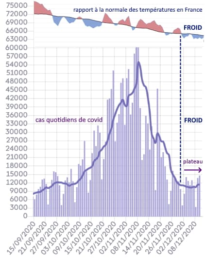 Cas de covid-19 par jour et évolution de la température moyenne du 15 septembre au 10 décembre 2020 - montage Météo Villes via France Info et Infoclimat