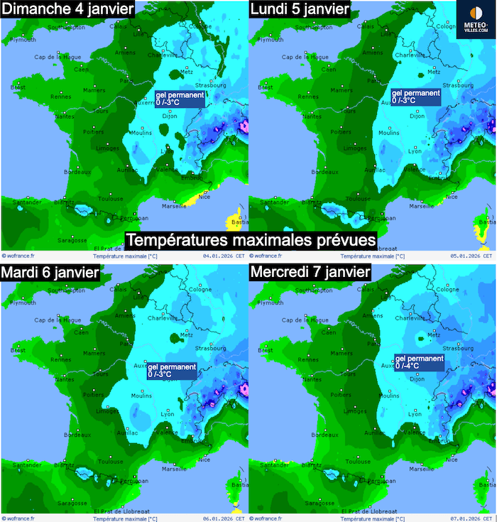 Prévisions des températures maximales entre dimanche 4 et mercredi 7 janvier - modèle global et fonds de cartes Wofrance.fr