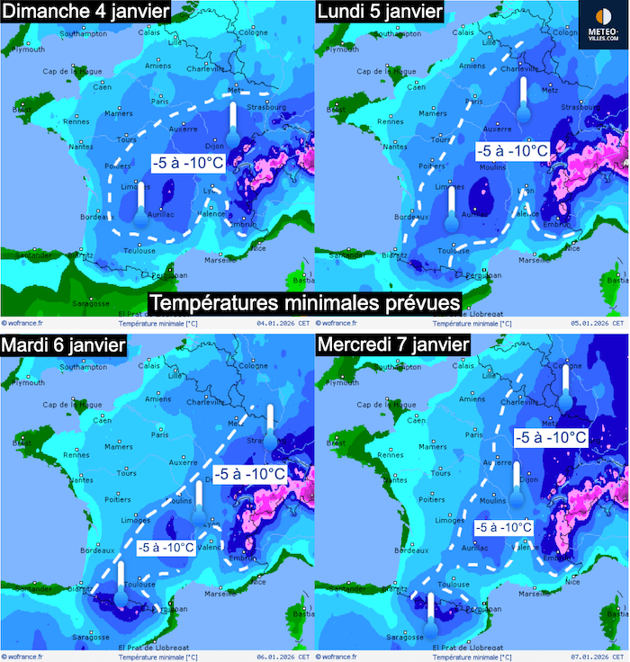Prévisions des températures minimales entre dimanche 4 et mercredi 7 janvier - modèle global et fonds de cartes Wofrance.fr