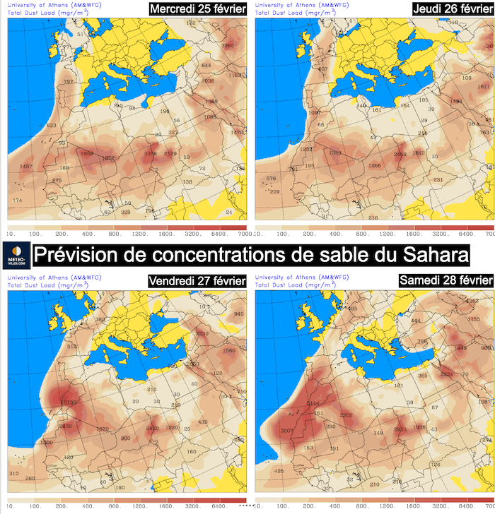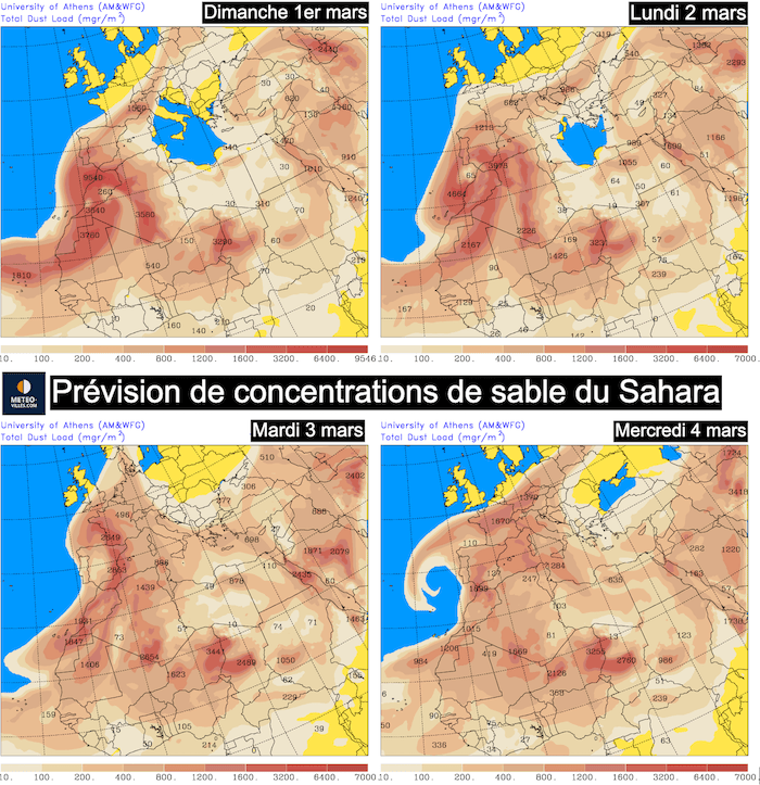 Prévisions des remontées de sable du Sahara entre le 1er et le 4 mars  - météo grecque (université d'Athènes)