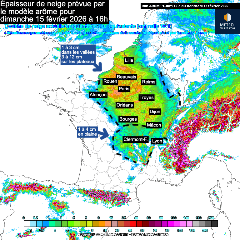 Simulation de l'épaisseur de neige prévue pour dimanche 15 février par le modèles météo ARPÈGE (français) - Meteociel