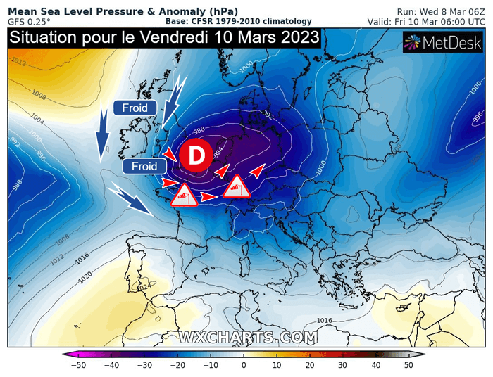 Les derniers scénarios envisagent désormais le creusement d'une dépression pour la journée du vendredi 10 mars 2023. Celle-ci devrait transiter vers la Manche avant de se décaler vers le Benelux, engendrant un fort coup de vent sur la moitié nord. À l'arrière de ce système dépressionnaire, le flux basculera au secteur nord-ouest et de l'air froid s'enfoncera temporairement sur le nord et l'est de la France pour la journée du samedi 11 mars. L'incertitude réside dans l'ampleur du froid advecté sur nos régions, qui dépendra du creusement de la dépression.