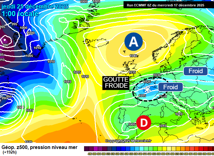 Goutte froide au dessus de la France le jeudi 25 décembre 2025 selon le modèle européen du 17/12/25 - via meteociel.fr