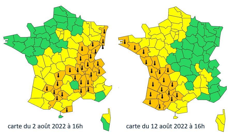 Cartes de vigilance à la canicule des 2 et 12 août 2022 - via Météo France