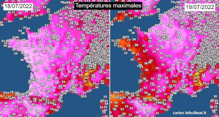 Températures maximales en France les 18 et 19 juillet 2022 - via infoclimat.fr