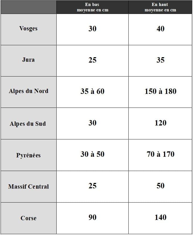 Paradoxalement, c'est du côté de la Corse que les quantités de neige sont les plus importantes sont observées à relativement basses altitude avec 90cm de neige en bas des pistes des stations de la région ! On relève également en moyenne 140cm sur les sommets en raison de l'instabilité récurrente concernant la région depuis la mi-janvier et de l'air suffisamment froid pour permettre à l'or blanc de tomber jusqu'à basse altitude.