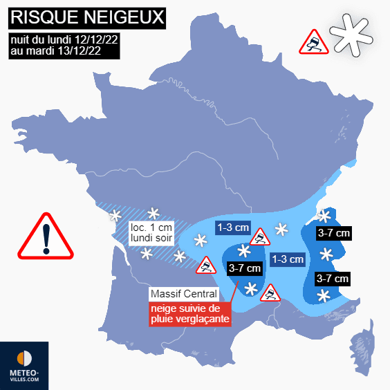 En se heurtant à l'air froid, les précipitations donnent temporairement de la neige dans le centre-ouest ce lundi soir (sols localement blanc sur les Charentes) puis sur le sud du Massif Central (jusqu'au nord du Gard) en début de nuit du lundi 12 au mardi 13 décembre 2022. Au fil des heures de la nuit, la pluie verglaçante prendra le relais (puis la pluie seule) tandis que les chutes de neige gagneront les plaines de Rhône-Alpes en déposant 1 à 3 cm en moyenne. Elles s'attarderont davantage dans les vallées alpines jusqu'en début de journée de mardi, notamment dans les basses vallées de Haute-Savoie et du bassin de Genève où il pourra neiger jusqu'à mardi midi avec des quantités de 3 à 7 cm aux altitudes les plus basses.