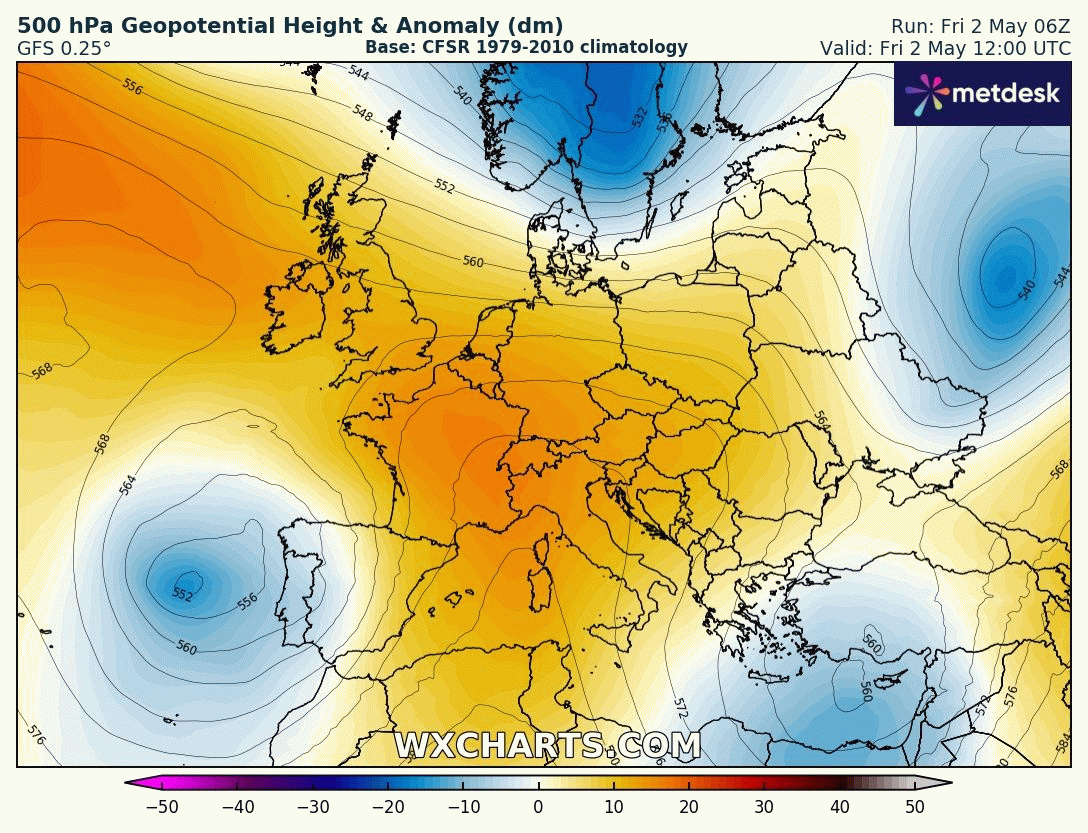 Animation des anomalies de températures sur l'Europe du 2 au 5 mai 2025 – Via TropicalTidBits