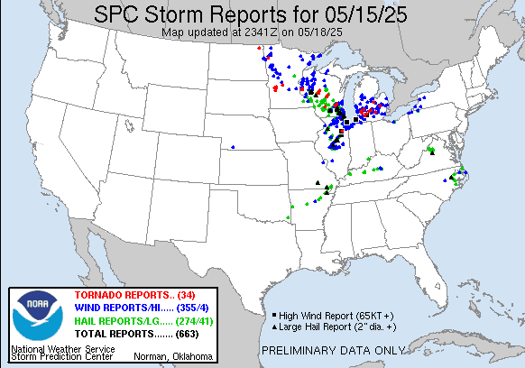 Reports de tornades, rafales, grêle et pluies intenses pour la journée du 15 mai 2025 – Storm Prediction Center