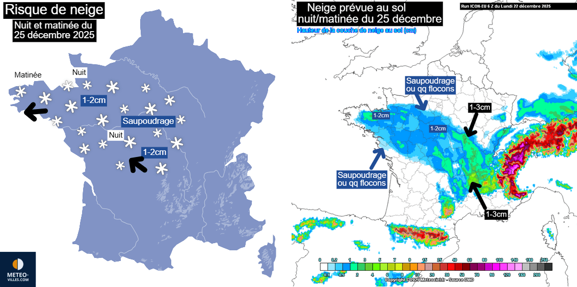 Risque de neige sur la France pour la nuit et la matinée du 25 décembre 2025 – Météo-Villes