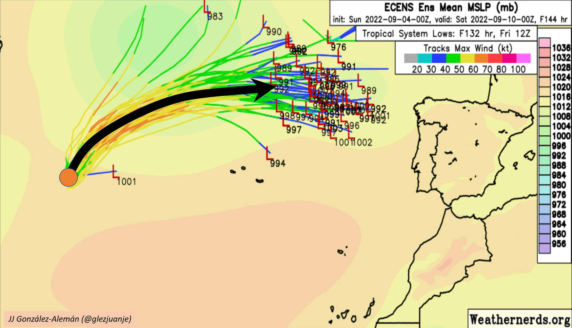 Trajectoire de la tempête Danielle telle qu'elle était envisagée la semaine dernière - via weathernerds.org & @glezjuanje