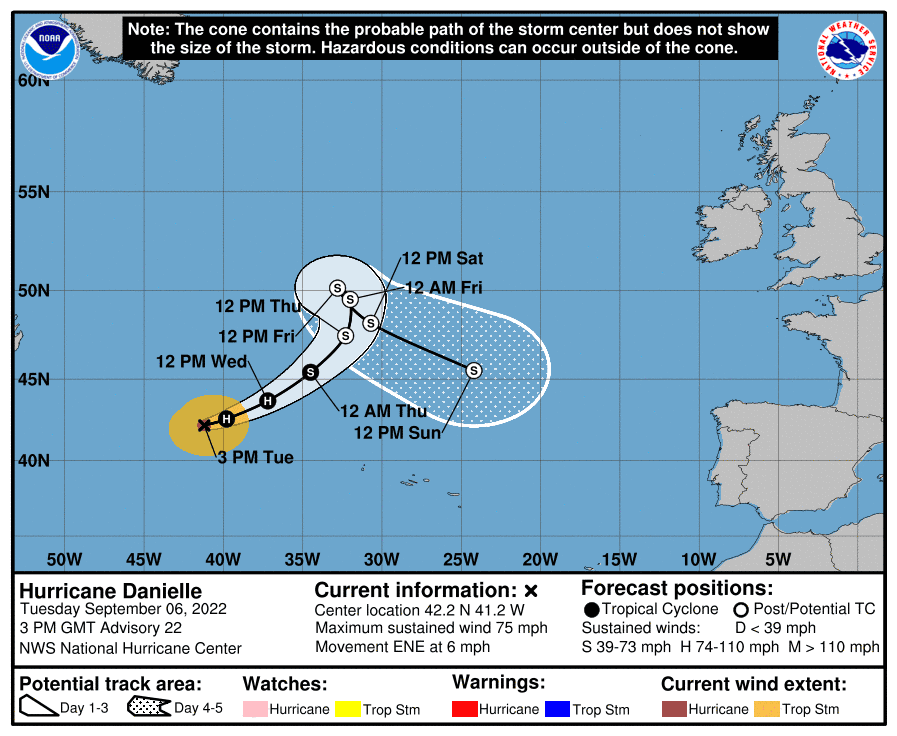Trajectoire prévue de Danielle jusqu'au dimanche 11 septembre 2022 - via NHC