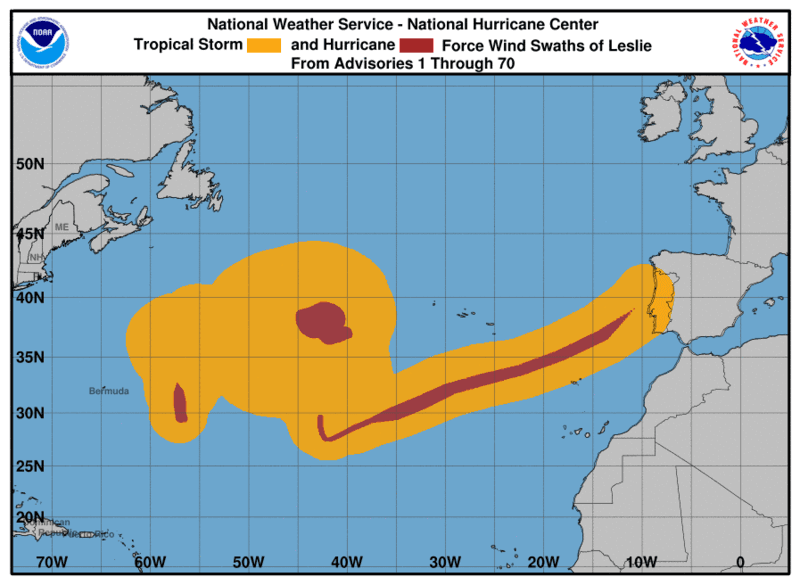 Force des vents de l'ouragan Leslie en octobre 2018 (rouge = ouragan, orange = tempête tropicale) - via NHC