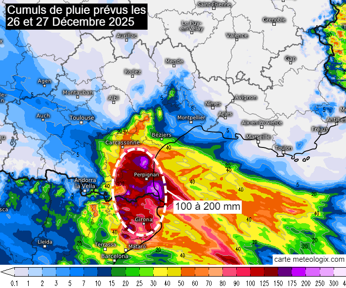 Il a déjà beaucoup plu sur l'Aude et les Pyrénées-Orientales ce vendredi 26 décembre 2025 et l'épisode n'est pas terminé. Les fortes précipitations vont se poursuivre tout au long de la nuit puis en journée du samedi 27 décembre 2025 en conservant des intensités marquées. Les cumuls, qui atteignaient déjà ponctuellement les 100 mm dans le Roussillon vendredi soir, pourront doubler d'ici à la fin de l'épisode avec des pointes locales de 200 mm ! Globalement, il tombera entre 100 et 200 mm en 48 heures sur une bonne partie de l'Aude et des Pyrénées-Orientales.