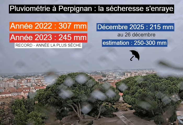 En 2022, il n'était tombé que 307 mm sur toute l'année à Perpignan, puis seulement 245 mm en 2023, année la plus sèche depuis le début des mesures ! Or, on atteint déjà 215 mm en ce mois de décembre 2025 et les pluies à venir feront grimper le cumul entre 250 et 300 mm. Il aura donc plu davantage sur ce seul mois de décembre 2025 que sur toute l'année 2023 !