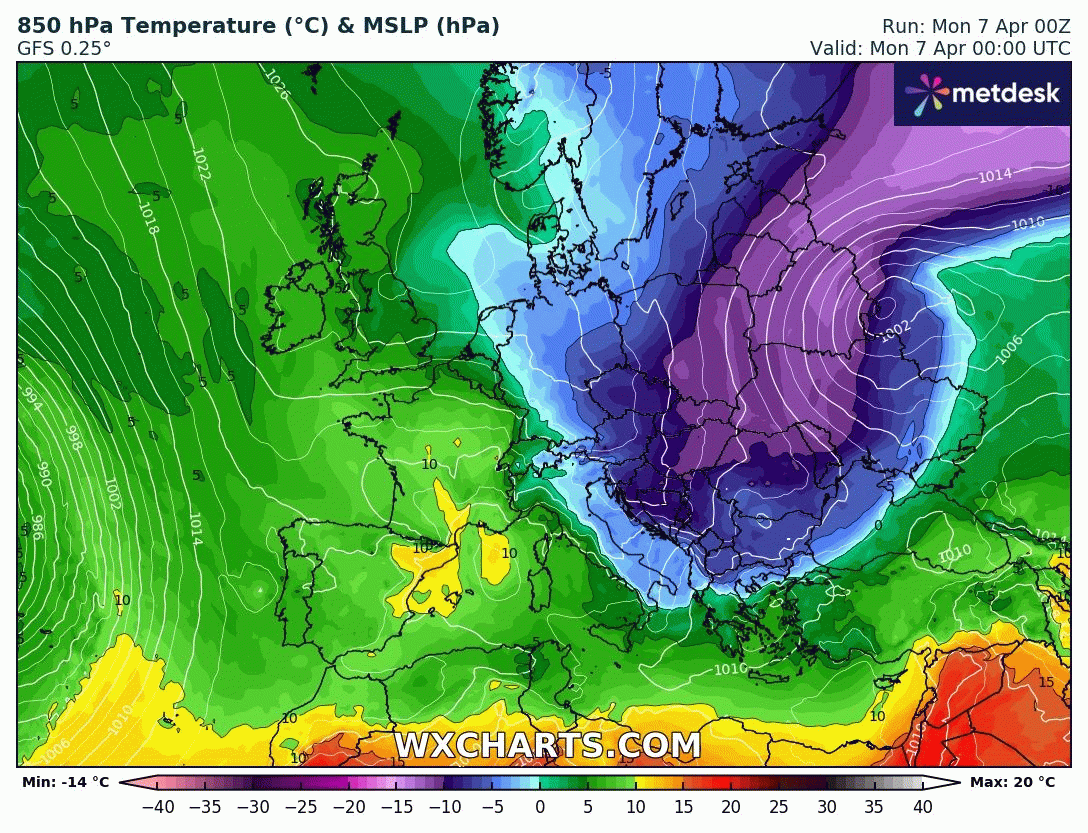 Animation des températures à 850 hPa sur l'Europe du 7 au 14 avril 2025 – Modèle GFS via WX CHARTS