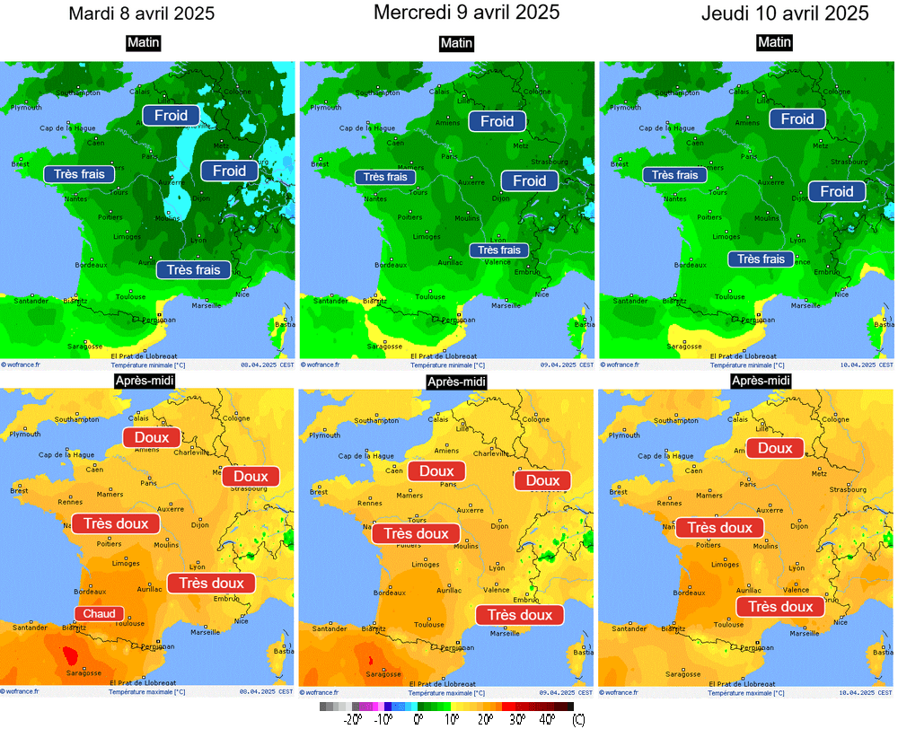 Températures minimales et maximales sur la France du 8 au 10 avril 2025 – WoFrance