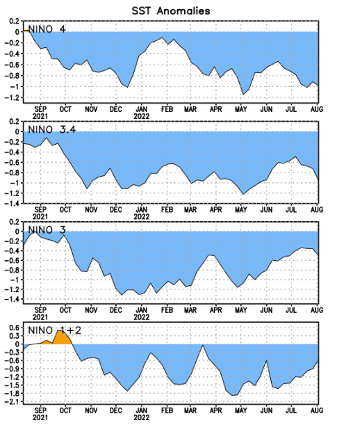Pour une circulation de type « La Niña », les températures de surface sur cette portion de l'océan Pacifique doivent être plus fraîches que la normale (au minimum -0.5°C d'anomalie sur trois mois consécutifs). Les conditions observées sont conformes à un phénomène La Niña : débuté courant août/septembre 2020, l'anomalie reste bien négative à l'heure actuelle sur les 4 zones de mesure (voir ci-dessous), en moyenne autour de -0.9°C sur la période mai-juin-juillet 2022.