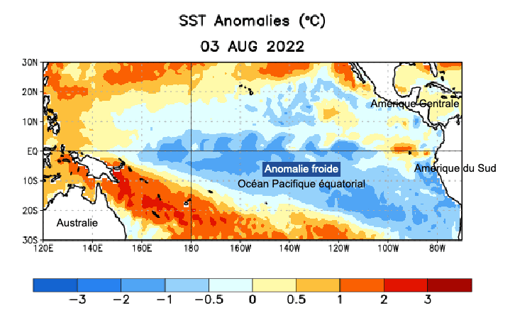 Alors que la température de l'océan Pacifique Équatorial reste bien fraîche, la prévision probabiliste pour ces prochains mois laisse entrevoir une poursuite de cette séquence « La Niña » au cours de la fin d'année 2022, et même jusqu'au début de l'année 2023. Pour la prochaine saison à venir (septembre - octobre - novembre), les chances d'une poursuite du phénomène sont estimées à environ 80%. Ceci diminue pour début 2023 (60% pour la période décembre-janvier-février) avant la fin possible de l'évènement au printemps 2023 (prévision "neutre" majoritaire).