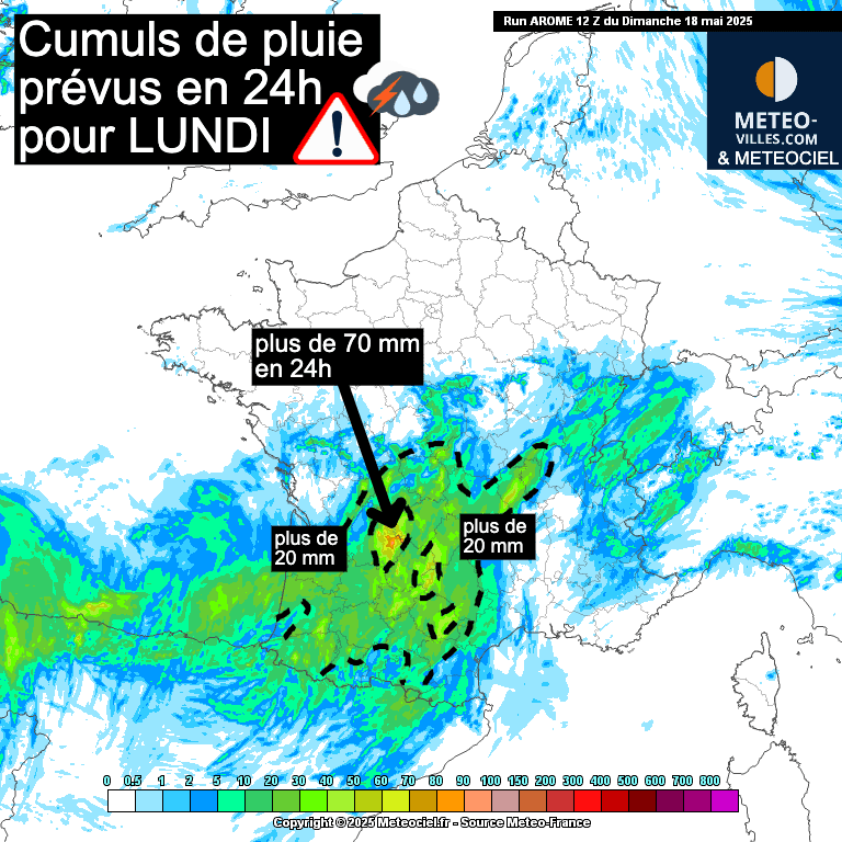 Au total sur la journée de lundi, on pourrait s’approcher des 70 à 100 mm de pluie en 24 heures sur l’Est de la Dordogne.