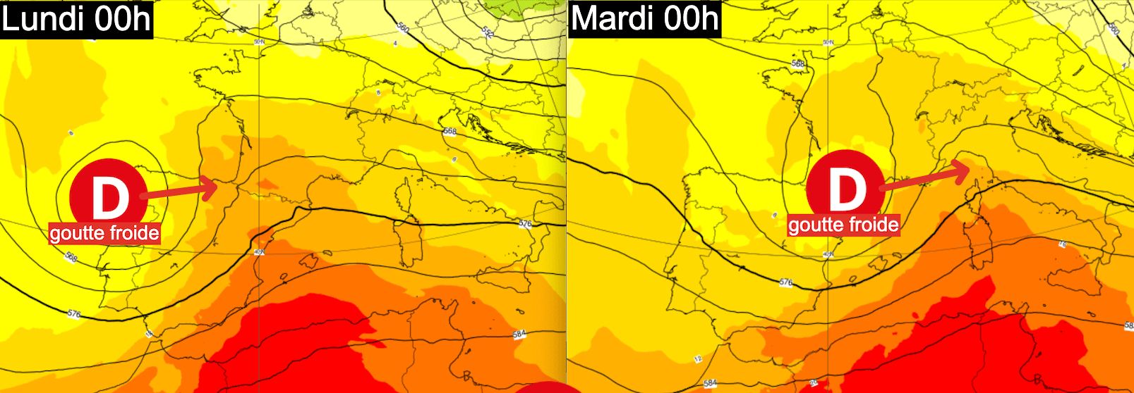 Ces orages sont liés à l’arrivée d’une goutte froide d’altitude qui va peu à peu se diriger vers le Sud-ouest de la France. Cette goutte froide (dépression en altitude, mais aussi au sol) va donc provoquer une importante dégradation orageuse qui concernera toutes les régions situées au sud d’une ligne La Rochelle, Bourges, Troyes, Strasbourg entre lundi matin et mercredi matin.