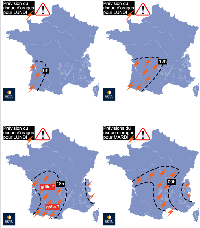 Au plus fort de la vague orageuse, de la grêle sera probablement observée sur l’Ouest du Massif central dans la soirée de lundi.