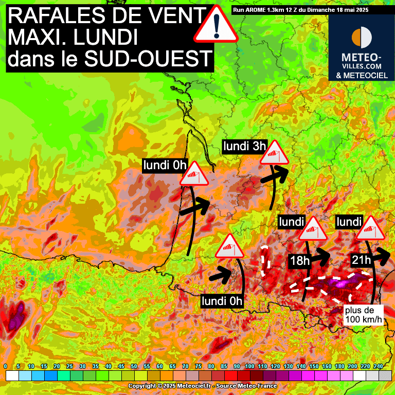 Rafales de vent maximales prévues entre la nuit de dimanche 18 mai à lundi et la soirée de lundi 19 mai dans le Sud-ouest. Modèle Arôme - Meteociel