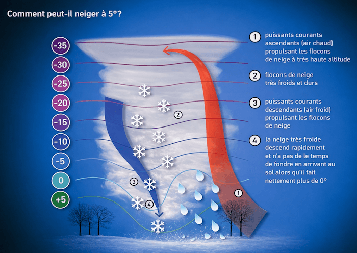 Schéma expliquant les giboulées et la possibilité de neige par température positive au sol - Météo Villes, livre Y'a plus de saison !