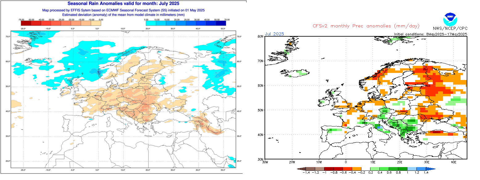 Anomalies de précipitations sur l'Europe pour le mois de juillet 2025 – ECMWF et CFS