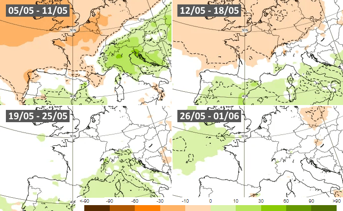 Anomalies pluviométriques hebdomadaires au mois de mai 2025 - modèle européen via ECMWF