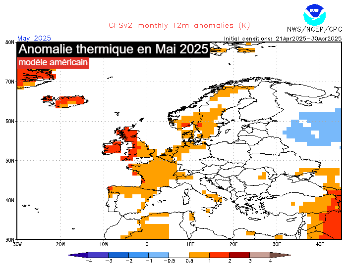 Anomalie thermique au mois de mai 2025 - modèle américain via NOAA