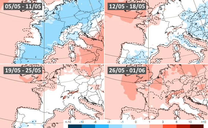 Anomalies thermiques hebdomadaires au mois de mai 2025 - modèle européen via ECMWF