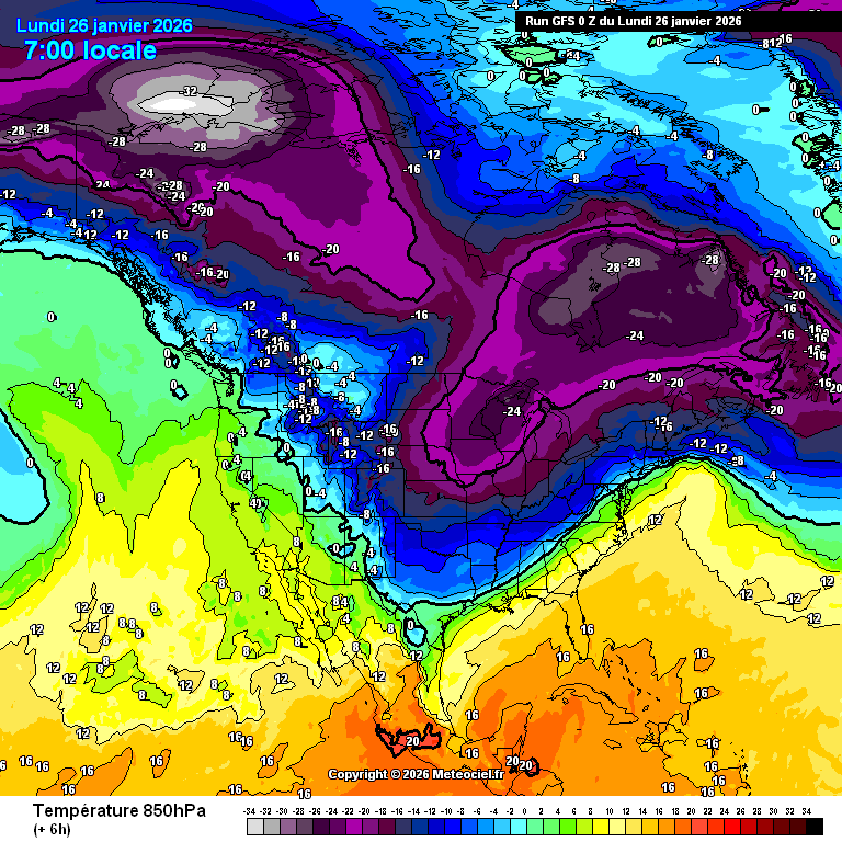 Animation des températures à 850 hPa sur l'Amérique du Nord du 26 janvier au 1er février 2026 – via Meteociel.fr