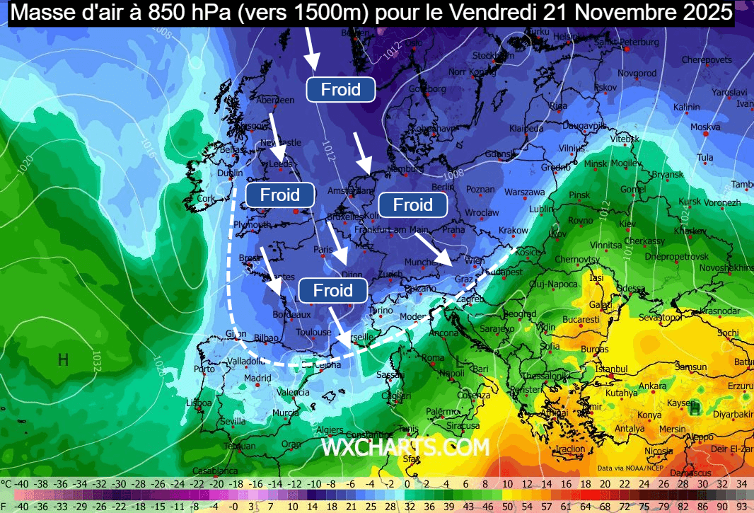 Masse d'air à 850 hPa (vers 1500m) pour le vendredi 21 novembre 2025 - wxcharts.com