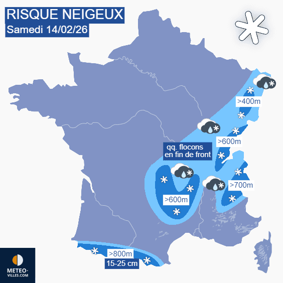 Risque de neige pour le samedi 14 février 2026 - Météo Villes