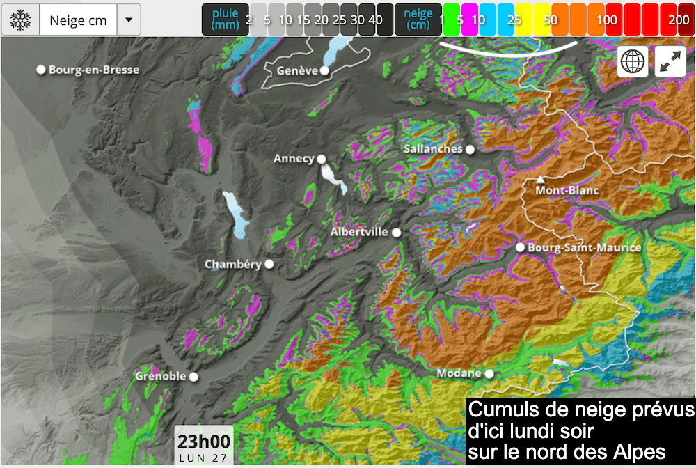 L'air frais de dimanche sera favorable à la neige dès 1000-1200 mètres mais les averses seront peu actives. Les cumuls qui concerneront le Massif Central s'annoncent donc faméliques. Dans les Vosges et le Jura, on peut attendre quelques centimètres tout au plus et parfois 10 cm dans le nord des Alpes. L'épisode marquant sera surtout celui de lundi 27 octobre 2025 avec des quantités bien plus importantes dans les massifs nord-alpins. Il neigera d'abord sous 1000 mètres en début de front puis la limite remontera vers 1800 voire 2000 mètres. À ces altitudes, il pourra tomber 20 à 40 cm. Depuis vendredi, les stations situées à 2000m ou plus pourront donc totaliser 50 à 70 cm !