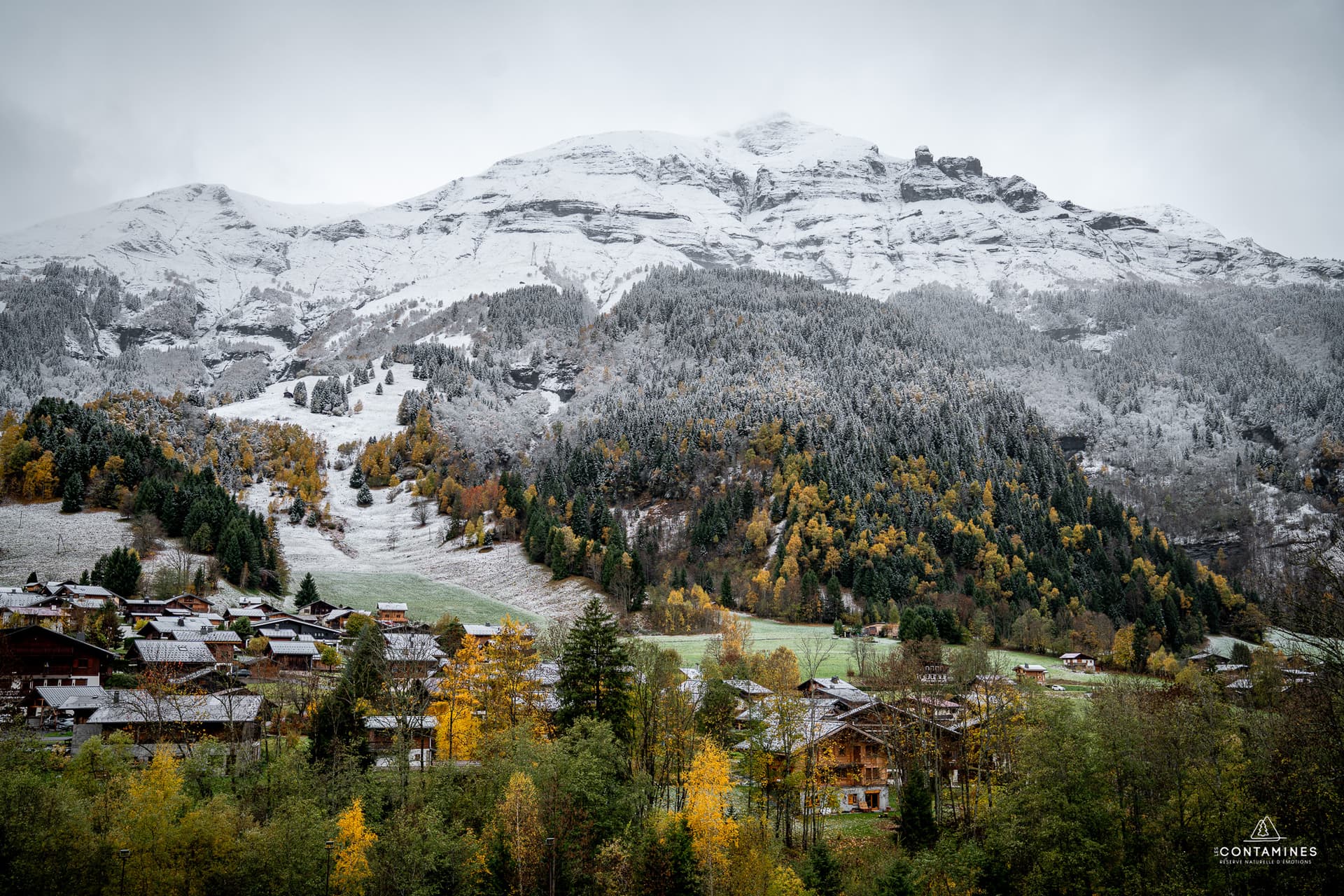 Ces chutes de neige ont également concerné le massif du Jura et ceux du nord des Alpes, où la limite pluie/neige est descendue vers 1000 mètres au lever du jour. Pour retrouver une tenue au sol, il fallait souvent se rendre autour de 1100-1200 mètres. La photo ci-dessous l'illustre parfaitement avec une limite se situant vers 1200 mètres aux Contamines-Montjoie en Haute-Savoie. On observe un joli contraste entre le blanc de la neige et les couleurs de l'automne.