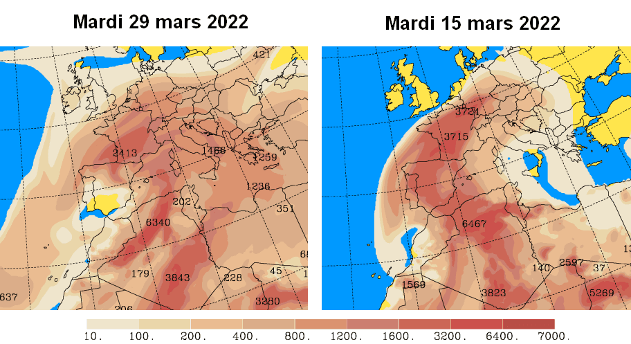 Outre la fréquence exceptionnelle des remontées de sable saharien, cette année 2022 a aussi été marquée par des épisodes d'intensité remarquable. Le mois de mars 2022 avait été exceptionnel avec deux épisodes aux concentrations de sable remarquables, au milieu puis à la fin du mois. Comme le montre ces cartes, les concentrations étaient nettement plus importantes que celles qui vont nous concerner cette semaine.