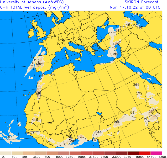Modélisation des dépôts de sable sous les pluies du lundi 17 au dimanche 23 octobre 2022 - via SKIRON