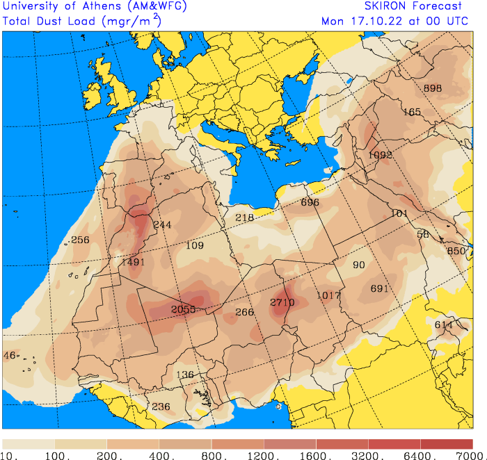Concentrations de sable dans l'atmosphère du lundi 17 au dimanche 23 octobre 2022 - via SKIRON