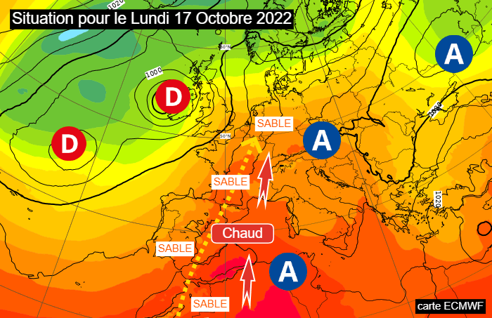 C'est une situation à laquelle nous commençons à être habitués en cette année 2022. Ces dernières heures, une zone dépressionnaire s'est positionnée au large de nos côtes, entre l'Atlantique et les Îles Britanniques. Pendant ce temps, l'anticyclone domine sur le bassin méditerranéen et l'Europe Centrale. Entre ces deux centres d'actions, la France se retrouve sous un flux de secteur sud prenant ses racines sur le continent africain. Il advecte un air remarquablement chaud pour la période et génère également la remontée de poussières sableuses venues du Sahara.