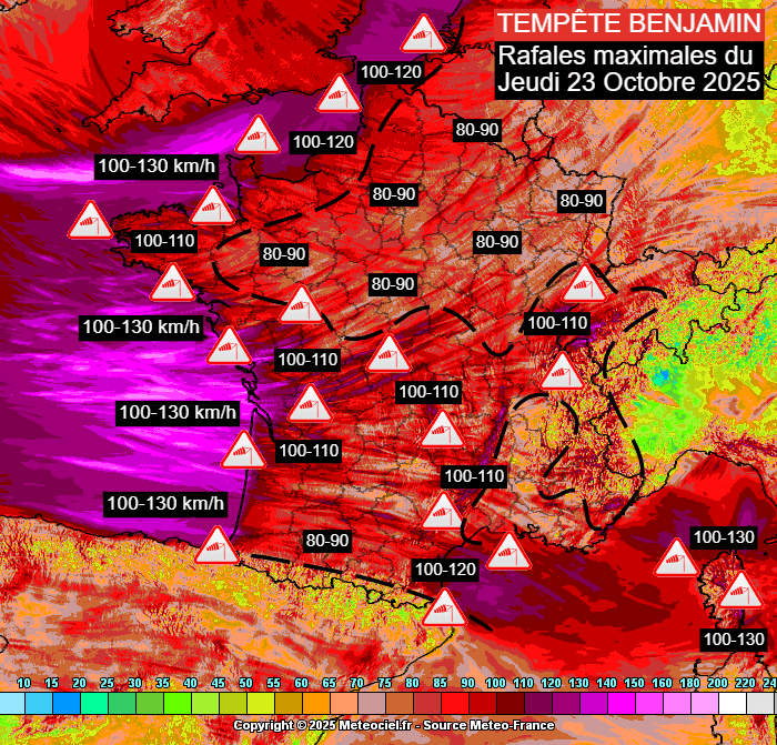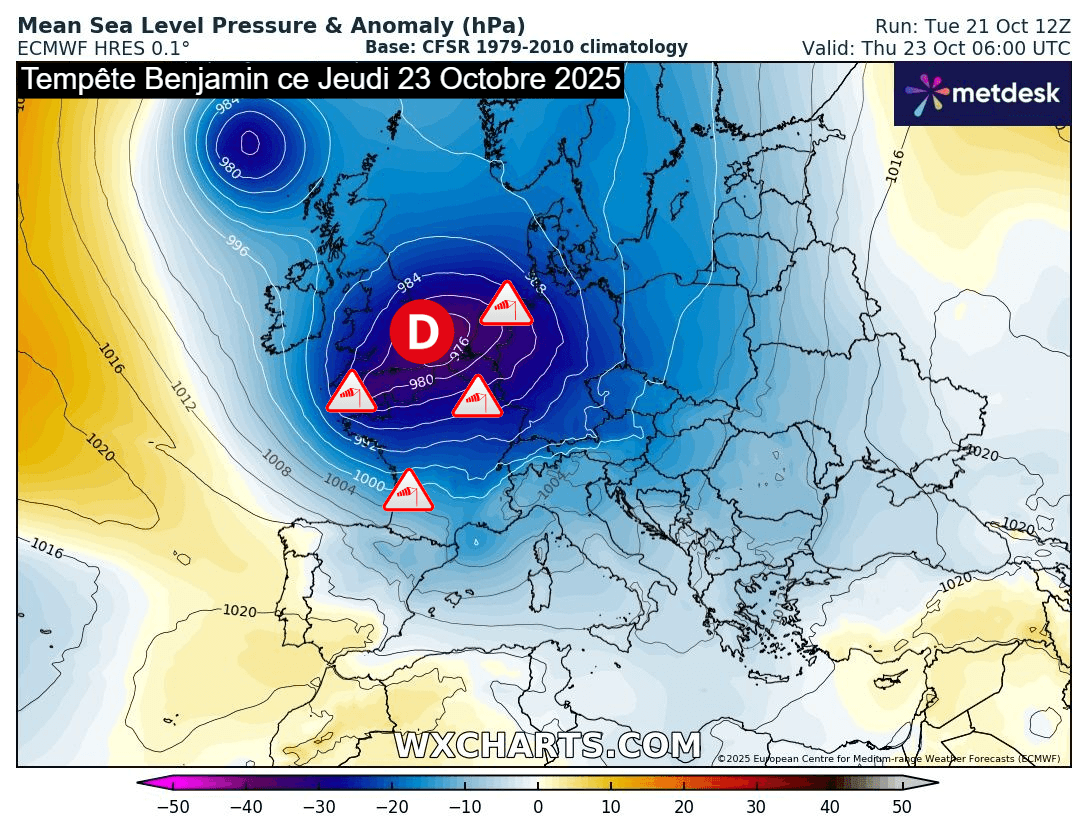 La dépression Benjamin se creusera en Manche durant la nuit du mercredi 22 au jeudi 23 octobre 2025. Selon les dernières modélisations, le cœur de la dépression devrait pointer sous les 975 hPa sur le sud de la Mer du Nord en matinée de jeudi. C'est au sud de la dépression que les vents les plus forts vont souffler, d'abord sur la Manche et l'Atlantique avant de gagner les terres d'une grande partie de la France. Rares seront les régions à échapper aux vents forts à tempétueux.