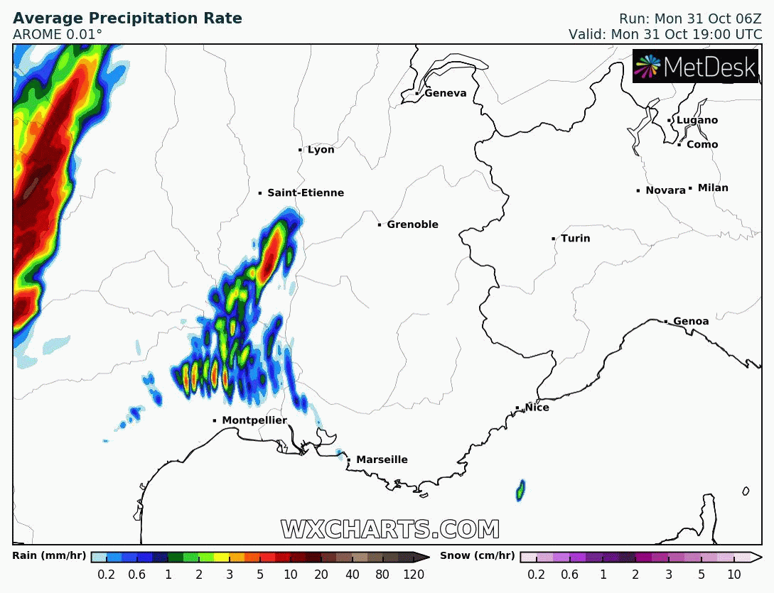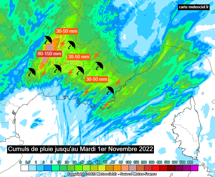 Le passage de cette dépression en Manche va soulever un air humide et instable sur le sud-est de la France. Il favorisera l'activation de précipitations fortes et orageuses sur les Cévennes dès la fin de journée du lundi 31 octobre 2022. Durant la nuit de lundi à mardi, un axe pluvio-orageux actif va se mettre en place sur la moyenne vallée du Rhône avant de progresser rapidement sur la région PACA, finissant sa course sur la côte d'Azur pour la matinée de la Toussaint.