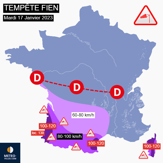 Rafales maximales prévues lors de la tempête Fien ce mardi 17 janvier 2023 – Météo Villes