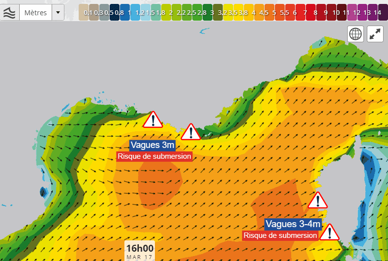 Enfin, ces vents violents vont générer une importante houle sur le bassin méditerranéen. Cette houle de secteur sud-ouest viendra notamment s'écraser sur la côte varoise et le littoral sud-ouest de la Corse où des creux de 3 à 4 mètres sont prévus en journée du mardi 17 janvier 2023. C'est la raison pour laquelle ces littoraux ont été placés en vigilance orange par Météo France. Les parties vulnérables du littoral risquent de subir des phénomènes de submersion. Évitez de vous approcher du bord de mer.