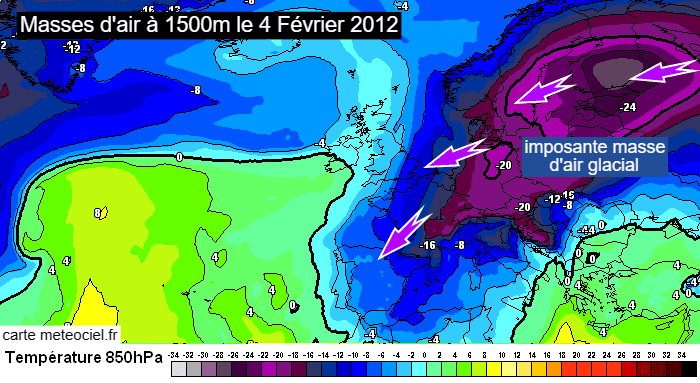 Masses d’air à 850 hPa (vers 1500m) le 5 février 2012 – via meteociel.fr