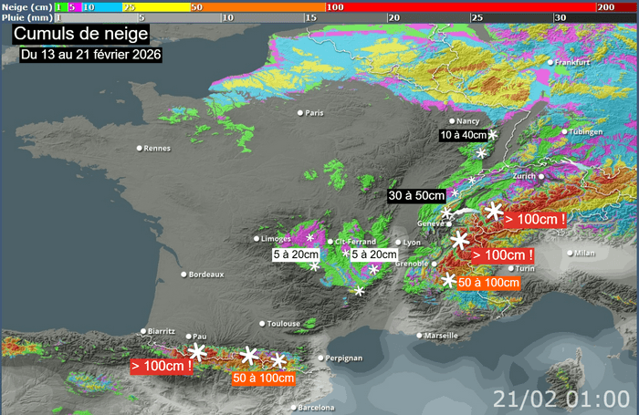 Cumuls de neige attendus en montagne jusqu'à 21 février 2026 - Via Skipass