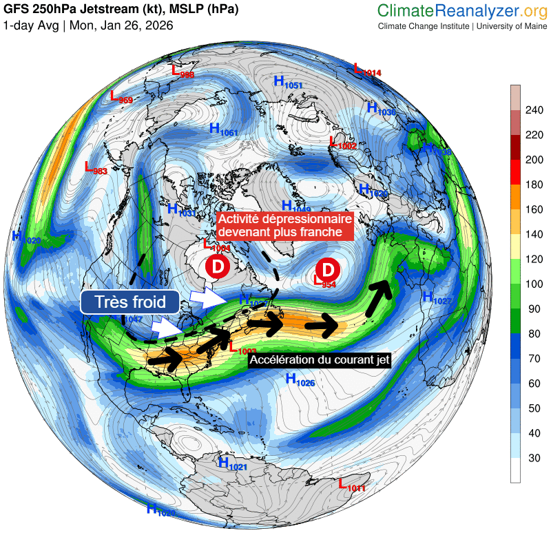 Néanmoins, l'arrivée de cet air froid au-dessus de l'Atlantique a bien une conséquence, qui influence effectivement le temps côté Europe. En effet, lorsque l'air froid atteint le nord-ouest de l'Atlantique (au-dessus de la Mer du Labrador), il accentue l'activité des dépressions. Le contraste entre l'air polaire survolant des eaux relativement douces permet le creusement rapide des dépressions.