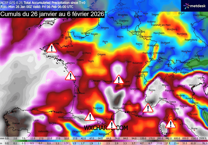 Cumuls de précipitations attendus jusqu'au 6 février 2026 – via WX CHARTS