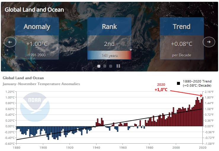 Voir 2020 devenir l'année la plus chaude en France depuis le début des relevés n'a rien de très surprenant lorsque l'on s'intéresse aux températures observées à la surface de la Terre cette année. En effet, 2020 devrait se classer au deuxième rang des années les plus chaudes depuis 1880 avec une anomalie mondiale autour de +1,00°C, juste derrière les +1,01°C de l'année 2016 mais devant les +0,94°C de l'année 2019.
